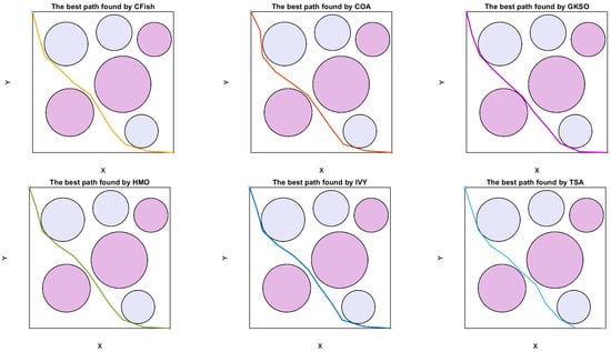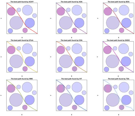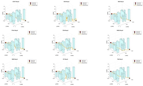 The comparison demonstrates that the difference in the quality of paths found by the competing algorithms vastly widens in the presence of greater environmental complexity. TSA shows the most cautious case of over-curvature that significantly adds mission distance and fuel burn, and CFish displays improper planning of an unjustifiably winding track that generates numerous direction alterations. Other algorithms, such as AOA, BOA, and COA, perform moderately well on relatively straight-line paths but do not have the accuracy of the best corridor discovery exhibited by ACIVY.