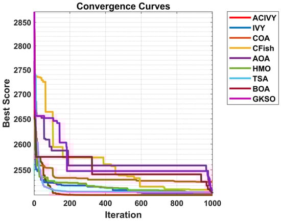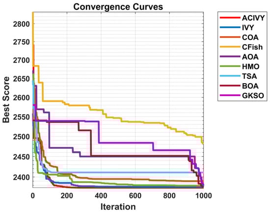 Figure 10, indicates the outstanding optimization dynamics and the excellent convergence properties of ACIVY within the UAV path planning application field. ACIVY shows the most aggressive and effective early-stage convergence behavior, falling quickly out of an initial cost of about 2900 to near-optimal costs of about 2500 in the first 100 iterations. Such a fast convergence implies that the algorithm has strong exploration abilities and effective search space exploration, which makes it quick to find and exploit good areas of the solution space. The algorithm shows consistent progress in optimization, and in the end, gives the minimum final cost compared to any other competitor. Comparatively, the GKSO and BOA algorithms exhibit slower rates of initial convergence, whereas CFish and TSA exhibit less reliable improvement trends with temporary periodical stagnation.