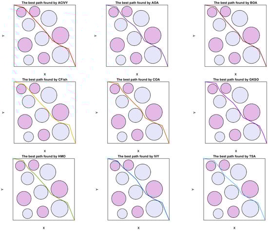 The comparative analysis shows a wide disparity in the quality and feasibility of paths found by the competing algorithms. The path of ACIVY shows a constant clearance margin to all threat boundaries without sacrificing the smoothness of the flight path, which implies a better constraint handling and multi-objective optimization ability. The algorithm is able to find the optimal corridor along the complex threat landscape without making unnecessary detours, and without entering dangerously close to high-intensity threat areas. Other algorithms, such as CFish and GKSO, exhibit a poor path planning performance, either by going too near the high-risk regions or by making unnecessary long diversions, which leads to an increase in the cost of the mission.