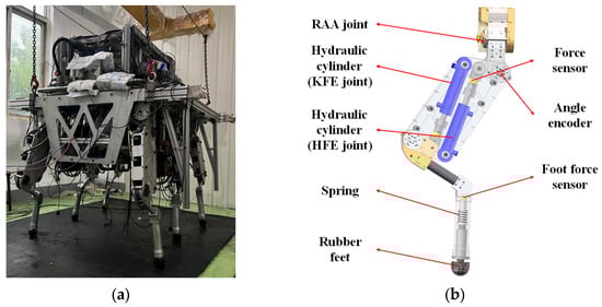The hydraulic hexapod robot prototype ZJUHEX01 and its single-leg structure: (a) hydraulic hexapod robot prototype; (b) schematic diagram of single-leg structure.