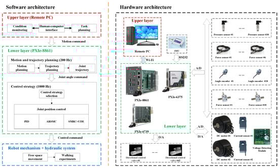 As the mechanical structure of the legged robot is inspired by an animal, the control system architecture can also equally take a bionic design. To realize the HHR’s locomotion, a hierarchical control system inspired by higher animal motion control systems is established, as shown in Figure 2. The control system contains an upper-layer remote PC and a lower-layer industrial computer PXIe-8861 from National Instruments (NI). The upper layer remote PC is mainly responsible for condition monitoring, human–computer interface (HMI) interaction, and task planning. In contrast, the lower layer primarily comprises the PXIe-8861 controller, which contains a PXIe-6375 data acquisition card and a PXIe-6739 data output card. These two modules, respectively, handle multi-sensor signal acquisition and control signal output. Motion and trajectory planning of the HHR can be achieved at a 200 Hz frequency, while different control strategies can be computed at a 1000 Hz frequency in the lower layer. Owing to the coordination of the upper and lower layers, diverse motion and task functions of the HHR can be realized. More details about the control system’s operation principle and sensor specification have been illustrated in detail in the Refs. [30,31].