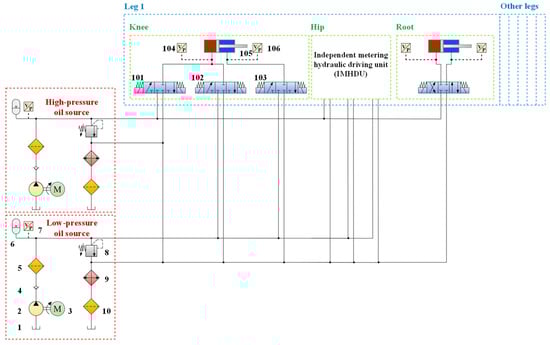 According to the principle of bionics, the energy supply system of a human or an animal includes an instantaneous energy system, a short-time energy system, and a long-time energy system, which generate the corresponding energy from anaerobic and aerobic metabolism, respectively. Drawing on this idea, an onboard bio-inspired two-stage supply pressure hydraulic system (TSS) is proposed in Figure 3. Specifically, a low-pressure oil source (18 MPa) with a high flow rate imitates the aerobic metabolism, which can maintain the low output power of the swing phase locomotion of the HHR. In comparison, a high-pressure oil source (6 MPa) with a low flow rate imitates anaerobic metabolism to supply the high output power of stance phase locomotion.