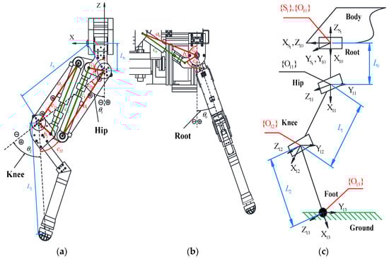 The coordinate system of the single leg HHR is also shown in Figure 4c, in which ,,,, and represent the leg base coordinate system, the root joint coordinate system, the hip joint coordinate system, the knee joint coordinate system, and the foot joint coordinate system, respectively. Using the Denavit–Hartenberg (D–H) method, the forward kinematics and inverse kinematics models are developed below: