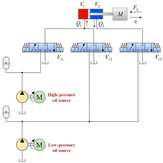 where , , and are the flow rate of three directional control valves , , and , respectively; is the valve’s flow gain coefficient.
