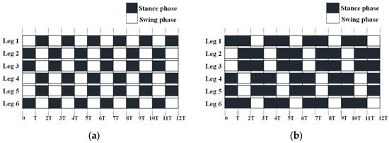 Time sequence diagram of the hydraulic hexapod robots walking forward in different gaits: (a) the tripod gait; (b) the quadrangular gait.