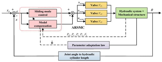 Adaptive robust control (ARC) is a control method that combines the advantages of adaptive control and robust control [34]. In the case of parameter uncertainty, the transient and steady-state errors can be controlled within a set of ranges through high-gain feedback. Combined with the sliding mode control (SMC) to form an adaptive robust sliding mode control (ARSMC), the original complex backstepping design process will be simplified to a feedback controller and sliding manifold design. The schematic of the ARSMC is illustrated in Figure 8.