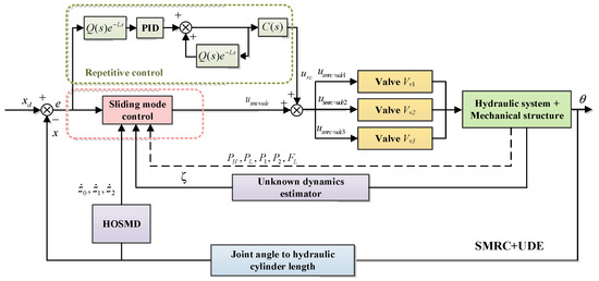 For this reason, a sliding mode repetitive control based on the unknown dynamics estimator (SMRC + UDE) is proposed to track the periodic joint trajectory and improve the control accuracy. On the one hand, the unknown dynamics estimator (UDE) deals with the lumped uncertain dynamic characteristics, such as the nonlinear and unmeasurable dynamics that cannot be modeled. On the other hand, considering the regular gait’s periodicity and the joint trajectory’s repetitiveness, the advantages of the repetitive control (RC) are combined with those of the proposed controller to form a sliding mode repetitive controller (SMRC). The schematic of the SMRC + UDE is illustrated in Figure 9.