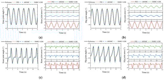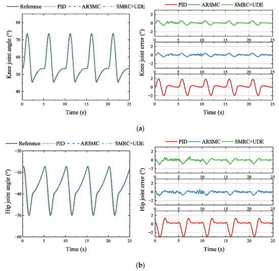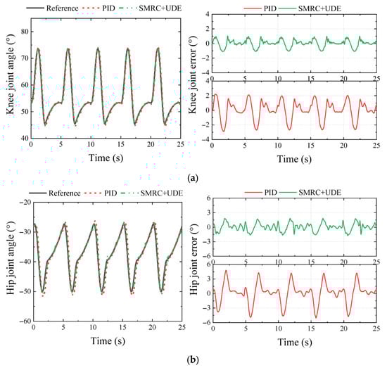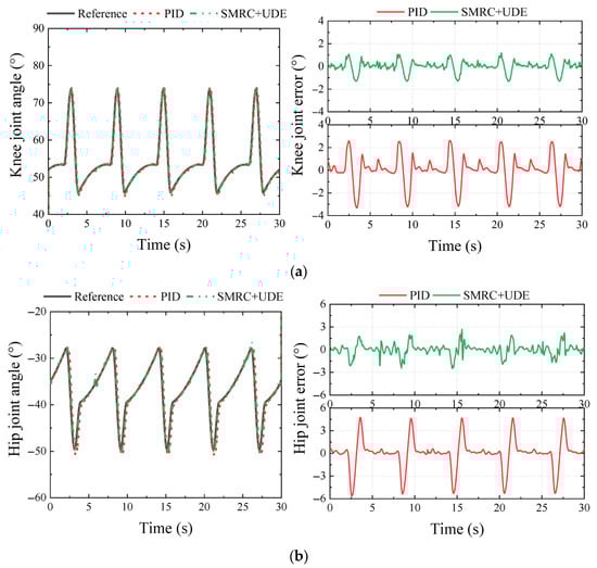 From Figure 15, the effectiveness of SMRC + UDE can also be verified. In the knee joint, the MAXE under SMRC + UDE and PID were 1.10° and 2.90°, respectively, representing an error reduction of 62.1%. In the hip joint, the MAXE under SMRC + UDE and PID were 1.79° and 5.04°, respectively, representing an error reduction of 64.2%.