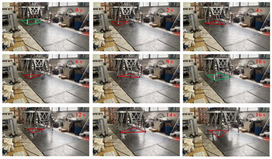 E4 evaluated a 0.2 Hz tripod gait of the HHR. The angle trajectory and tracking errors are shown in Figure 15. The snapshot of the E4 in 0–16 s is shown in Figure 16, where the red triangles in the figure represent the support triangle of the stance legs in the tripod gait, and the green quadrangles indicate the support polygon of all six stance legs.