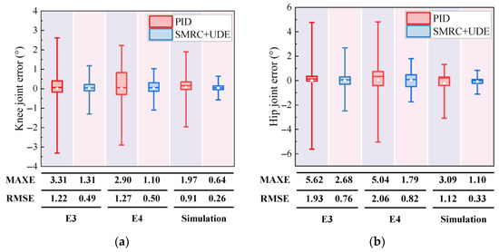 For example, the knee joint error of PID showed a MAXE of 3.31° in E3, 2.90° in E4, and 1.97° in the simulation. For the hip joint, the MAXE of PID was 5.62° in E3, 5.04° in E4, and 3.09° in the simulation. Concerning the proposed SMRC + UDE, the knee joint error showed a MAXE of 1.31° in E3, 1.10° in E4, and 0.64° in the simulation. For the hip joint, the MAXE was 2.68° in E3, 1.79° in E4, and 1.10° in the simulation. Compared with PID, the knee joint error could be reduced by 60.6% in E3, 62.1% in E4, and 70.35% in the simulation, while the hip joint error could be reduced by 52.3% in E3, 64.2% in E4, and 64.19% in the simulation, respectively. Furthermore, the RMSE of the knee joint could reach 0.49° in E3, 0.50° in E4, and 0.26° in the simulation, while the RMSE of the hip joint could reach 0.76° in E3, 0.82° in E4, and 0.33° in the simulation.