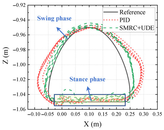 In addition to the joint tracking, the foot trajectory of Leg 1 in the XZ plane could be calculated with forward kinematics, as shown in Figure 19. The improvement in the joint trajectory tracking in the SMRC + UDE could be displayed by the tracking errors in the X and Y directions when the leg was in the swing phase, which showed smaller deviations from the reference. However, when the leg was in the stance phase, the foot trajectory of both PID and SMRC + UDE showed a certain degree of shock and oscillation. Meanwhile, it was determined that, although E4 gained better tracking performance than did E3, the snapshot of E3 demonstrated better motion stability and less shaking of the HHR than did E4. These two phenomena may be related to the interaction between the robot’s feet and the outside environment. The question of how to balance the relationship between robot joint control and body motion urgently needs to be followed up in subsequent research.