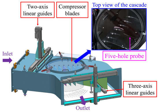 Experiments were carried out in a low-speed linear compressor cascade wind tunnel at National Cheng Kung University in Taiwan, as illustrated in Figure 1. In the test section, the free-stream turbulence intensity was measured to be below 0.7% within a velocity range of 5–20 m/s. Tailboards were installed at the trailing edges of the first and seventh blades to ensure uniform inflow and maintain periodic flow conditions in the cascade.