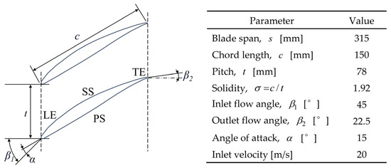 The cascade blades used in this study feature a widely utilized NACA65810 airfoil, commonly referenced in the literature [19]. The schematic of the blade geometry is shown in Figure 2, along with the designed inlet velocity of 20 m/s, the specific geometric parameters, and the relative operating conditions employed throughout both the experiments and numerical simulations in this study.