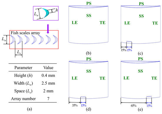 Configurations of cascades with a fish scale structure. (a) Geometric parameters of the fish scale. (b) An ORI case without fish scales. (c) Case 1: fish scales laid across 15–30% of the chord. (d) Case 2: fish scales laid across 35–50% of the chord. (e) Case 3: fish scales laid across 65–80% of the chord.