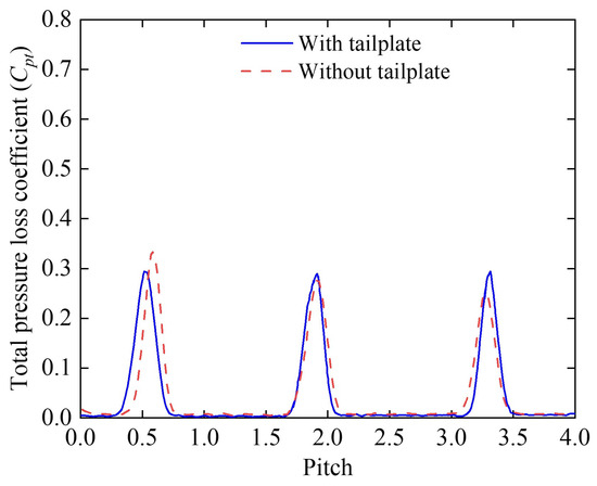 To confirm the periodicity of the flow field, a five-hole probe was used to measure the total pressure loss distribution at the cascade outlet. The probe was placed at the middle span of the blade, 0.1c away from the trailing edge of the blade. This verification ensured the feasibility of applying periodic boundary conditions to reduce computational effort without compromising accuracy. Figure 4 illustrates the distribution of the total pressure loss at the mid-span of the outlet for the ORI case, under conditions of V = 20 m/s and α = 15° along the grid pitch. A comparison of the wake profiles on either side with the mainstream parameters confirmed that the tailboard-equipped cascade exhibited highly periodic outlet airflow.