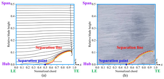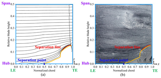 Limiting streamlines on the suction surface of the blade in the ORI case. (a) Numerical simulation results; (b) experimental oil-film visualization.