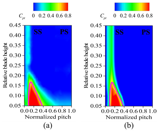 Figure 16 shows the limiting streamlines on the suction surface; the solid orange line represents the separation line for the ORI case, the red dotted line indicates the separation line for the other cases, and hpd represents the spanwise penetration depth. The spanwise penetration depths in Case 1 and Case 2 were nearly identical to that of the ORI case, indicating no significant improvement. Conversely, Case 3 demonstrated a substantially reduced spanwise penetration depth compared to the ORI case, indicating a lower total pressure loss in this configuration. Overall, cases with diminished low-energy-fluid region and decreased total pressure loss also exhibited reduced spanwise penetration depth. This is consistent with previous findings by Wang et al. [30] and Benner et al. [14,15], highlighting the effectiveness of Case 3 in mitigating corner separation and enhancing cascade performance.