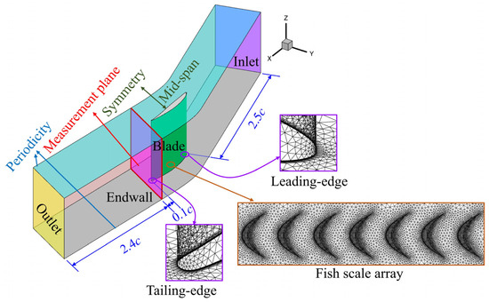 The inlet velocity and turbulence intensity, as determined experimentally, were prescribed at the boundary, while the outlet was set as the atmosphere boundary. The blade’s surface and end-wall’s surface were modeled with no-slip boundary conditions, while both the right and left walls utilized translational periodic boundary conditions. The computational grid near the end-wall and the fish scale structure was refined to accurately capture complex secondary flow structures in the cascade, ensuring that the y+ value was close to 1, as required for the Shear Stress Transport k-ω turbulence model (Figure 7).
