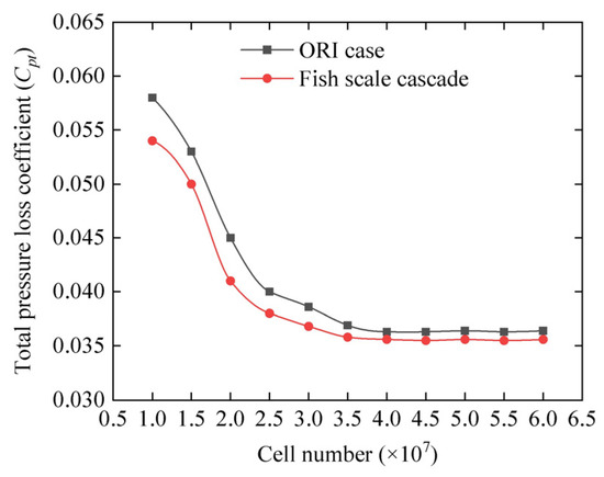 The effect of varying grid resolutions (i.e., number of cells) on the total pressure loss coefficient distribution at x/c = 1.1 downstream of the cascade is shown in Figure 8. The results include both the baseline case without fish scale structures (ORI case) and case with fish scale structures (Case 3). When the cell number was increased from 4.5 million, the total pressure loss coefficient at the cascade outlet showed minimal variation. Hence, to ensure computational accuracy while optimizing resource use, a grid resolution of 4.5 million cells was selected for subsequent numerical calculations.