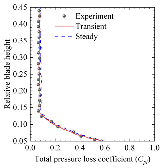 Comparisons of the spanwise mass-averaged total pressure loss coefficient (Cpt) obtained from transient simulation at t = 0.07 s (time stepsize 10−6), steady-state simulation, and experimental measurements for the ORI case.