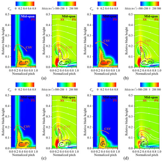 Contours of total pressure loss coefficient (Cpt) and helicity (H) at the cascade outlet. (a) ORI case; (b) Case 1; (c) Case 2; (d) Case 3.