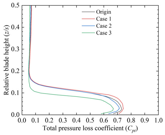 Spanwise distribution of the pitch-averaged total pressure loss coefficient (Cpt) for the four cascade cases.