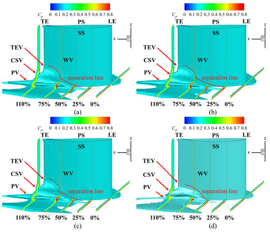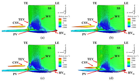 Three-dimensional vortex structure within the cascade. (a) ORI case; (b) Case 1; (c) Case 2; (d) Case 3.