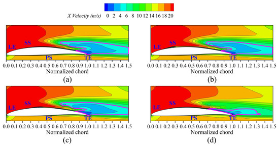 X-velocity contour at a blade height of z/s = 4%. (a) ORI case; (b) Case 1; (c) Case 2; (d) Case 3.