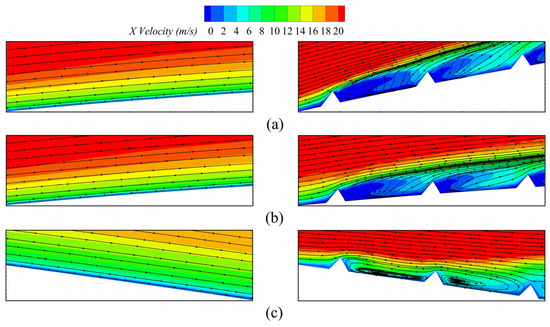Local flow structure at a blade height of z/s = 4%. (a) ORI (left) and Case 1 (right); (b) ORI (left) and Case 2 (right); (c) ORI (left) and Case 3 (right).