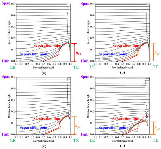 Numerical limiting streamlines on the suction surface in various cascade cases. (a) ORI case; (b) Case 1; (c) Case 2; (d) Case 3.