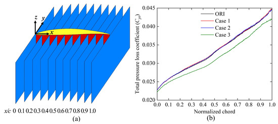 Distribution of total pressure loss coefficient in various cascade cases. (a) Slice surfaces along chord direction used to calculate total pressure loss coefficient; (b) total pressure loss coefficient along chord direction.