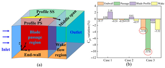 The computational domain was divided into four distinct areas to assess the distribution of total pressure loss across the cascades. These areas included the end-wall region, the passage region, the wake region, and the zone near the blade surface representing the blade profile. This division is illustrated in the three-dimensional (3D) diagram in Figure 18a. Figure 18b illustrates the total pressure loss in four regions for three cases. Each value represents the proportion of fish scale cases to ORI cases in the total pressure loss coefficient. In Case 1, the total pressure loss decreased in both the end-wall and wake regions but increased in the blade profile region. Case 2 showed reductions in the end-wall and passage regions, though losses in the blade profile region also increased. Notably, case 3 effectively reduced total pressure loss across all regions, particularly with reductions of 9.7% in the passage region and 3.35% in the end-wall region, indicating it as the most effective design configuration. This improvement is attributed to the placement of the bio-inspired fish scale structure ahead of the CV, which reduced the volume of the PV structure and the low-energy-fluid region near the end-wall, thereby enhancing overall cascade performance.