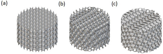 The effect of the unit cell’s rotation angle on the lattice configuration for solid-based Diamond TPMS with a thickness of 0.3, a height of 5 mm, and a diameter of 20 mm with the unit cell sizes of 3, 3, and 4 mm in the X, Y, and Z directions, respectively, for (a) 0, (b) 30, and (c) 60 degrees.