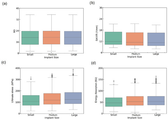 In Figure 3c, the boxplot of U shows a progressive increase from small to large implants. Median U values are higher in medium and large implants than in the small group, and the range of stress values broadens with increasing size. The large group achieves a higher upper range (~370 MPa), and a greater number of high-value outliers, indicating higher mechanical strength. The ascending trend in U from small to large implants underscores the role of physical volume and structure reinforcement in bearing higher loads. This suggests that larger implants tend to be more robust mechanically, although their increased variability may result from more complex failure mechanisms, such as local buckling.