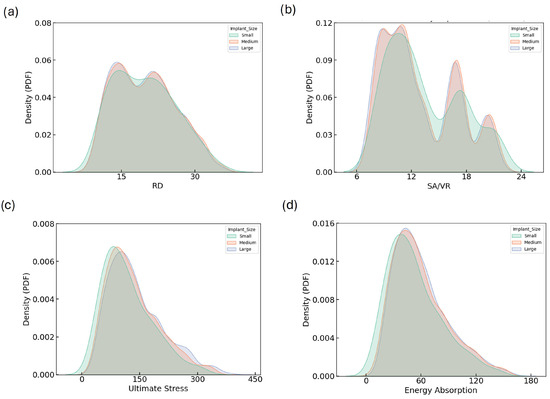 KDE plots provide a detailed view of the distributions of geometric and mechanical properties across implant size groups. Figure 4 illustrates the KDE plots for RD, SA/VR, U, and EA across all implant sizes. The RD distributions (Figure 4a) show notable overlap among small, medium, and large categories, all peaking consistently around 18–20%, indicating well-controlled design uniformity regardless of implant size. In contrast, the SA/VR plot (Figure 4b) reveals a broader and more varied distribution in small implants, characterized by multiple peaks, whereas medium and large implants exhibit narrower, centralized curves. This highlights the potential of small implants to provide enhanced surface complexity, beneficial for biological integration.