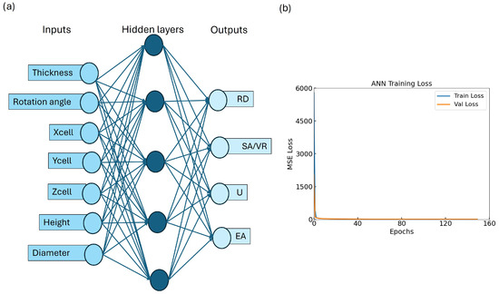 Overview of model performance: (a) ANN architecture; (b) training–validation loss curve showing convergence and minimal overfitting.
