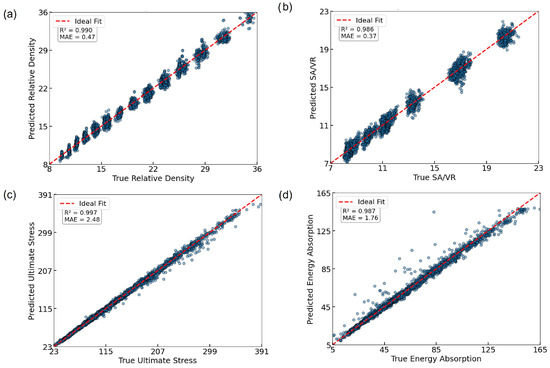 The dataset of 3024 lattice samples was randomly split into 80% for training (2419 samples) and 20% for testing (605 samples), with all features scaled using the StandardScaler. Model evaluation included and mean absolute error (MAE) metrics for each output. The trained ANN model served as a surrogate model in the multi-objective optimization step, enabling rapid prediction of properties for unrecognized designs. K-fold cross-validation was not applied; the model was evaluated on a completely unseen test set, and the consistently high values demonstrate its strong generalization performance.