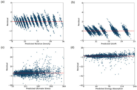 To further evaluate the prediction behavior of the ANN, residual plots were generated for each target variable (Figure 7). All residuals were tightly clustered around zero, indicating low bias and good predictive alignment. For RD (Figure 7a) and SA/VR (Figure 7b), a discrete banding pattern emerged, due to the limited granularity of the input parameters. Despite this, the residuals remained within a narrow range. Ultimate stress (Figure 7c) exhibited a mild heteroscedastic trend, with increasing variance at higher stress values, yet without significant systematic error. The energy absorption plot (Figure 7d) revealed slightly heavier-tailed errors, particularly underestimation at higher values, but the central distribution remained balanced. Overall, the residuals validate the ANN model’s robustness across all four outputs.