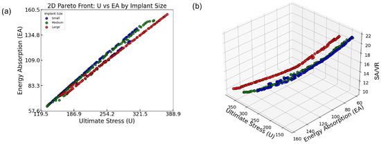Figure 8a presents the 2D Pareto fronts for the three implant size groups based on two key mechanical objectives: U and EA. Each point represents a Pareto-optimal lattice design, meaning that no other design in the solution set improves one objective without compromising the other. A clear, strong positive correlation is observed between U and EA across all groups: as ultimate stress increases, so does energy absorption. This trend highlights a favorable synergistic relationship between load-bearing capacity and energy dissipation, both of which are crucial for orthopedic implants that must withstand mechanical loading while minimizing damage transfer to the surrounding bone.