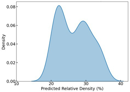 KDE of predicted RD after filtering, showing a bimodal distribution with all values constrained between 20 and 40%, aligning with the targeted range for trabecular bone analogs.