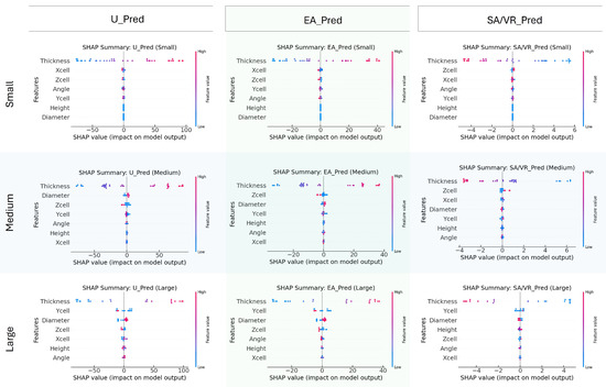 To interpret the contribution of each design parameter to model predictions, SHAP values were computed for three target outputs, U, EA, and SA/VR, stratified by implant size. Figure 10 visualizes these results, allowing a comparative interpretation of feature importance and effect direction. For ultimate stress, thickness is consistently the most influential feature across all implant sizes, exerting a strong positive influence when its value is high. In medium and large implants, diameter and Zcell also play prominent roles, indicating that both wall dimension and unit cell complexity contribute significantly to stress-bearing capacity. Interestingly, in the small group, spatial dimensions such as Xcell and Zcell hold more importance compared to Diameter, suggesting that geometric layout dominates strength behavior at smaller scales.