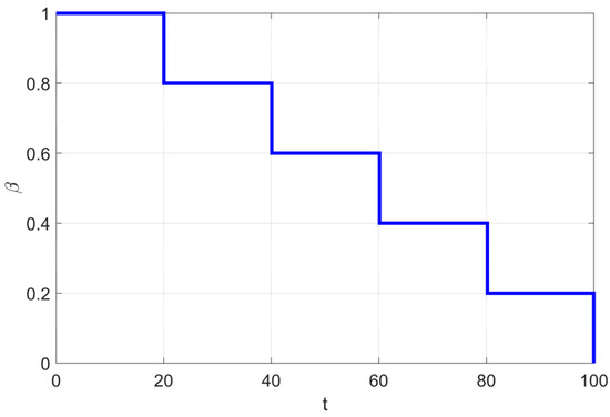 As mentioned in Section 2.2, β is a trapezoidal decreasing function (Equation (3)) used in the original algorithm to simulate changes in the external environment. Its value decreases with the number of iterations, enabling a stepwise transition between large-scale exploration and small-scale exploitation. The parameter w in Equation (3) needs to be manually adjusted to control the number of trapezoidal segments.