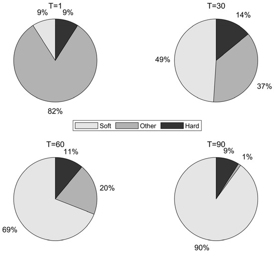 The data at iterations 1, 30, 60, and 90 were selected to simulate the early, early-middle, middle-late, and late stages of algorithm execution. The proportion of agents satisfying soft frost search (Condition 1), hard frost search (Conditions 2 and 3), and other agents (Condition 4) was calculated, and the results were visualized as the pie charts shown in Figure 3.