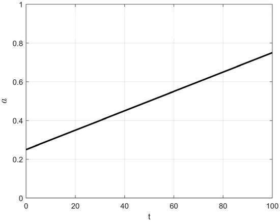 To better distinguish between these two types of agents and to adapt to the increasing overall fitness of the frost population as the iteration process progresses, an adaptive control factor, a, is introduced to regulate the triggering probability of the elite learning strategy. The calculation of a is given by Equation (9), and its variation trend is shown in Figure 4. As seen in Figure 4, a increases linearly from an initial value of 0.25 to 0.75 as the number of iterations t increases. This linear increase controls the number of agents satisfying Condition (5) throughout the iterations. Furthermore, as shown in the elite learning formula (Equation (10)), the use of a along with the normalized fitness value of an agent as the triggering condition ensures that only agents with relatively small random numbers and low fitness (i.e., agents corresponding to Scenario 2 described earlier) execute the elite learning strategy.
