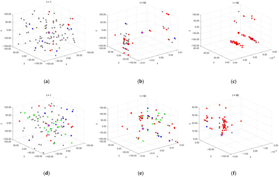 As the iterations progress, elite population agents maintain a certain proportion in the mid-iteration phase (t = 50) but significantly decrease in the late iteration phase (t = 90), demonstrating that the control factor effectively regulates the probability of elite agent generation. The introduction of the control factor ensures that the early iteration phase is still dominated by non-mutated agents, whereas the late iteration phase is primarily driven by the soft frost and hard frost populations. This mechanism enhances early-stage exploration while preventing premature convergence or insufficient exploitation due to excessive or premature elite population generation.