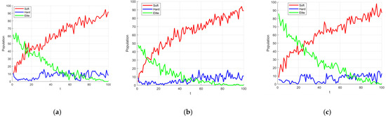 The conditions for generating the aforementioned four types of individuals have different values at various stages of the algorithm’s execution. This can lead to a series of defects and shortcomings in the population of individuals during the update process. To visually illustrate how the number of agents meeting different conditions changes during various iterative phases of the algorithm, this study conducted a 100-iteration experiment with 100 agents from the original algorithm.