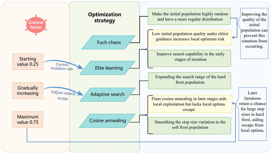 The adaptive search strategy refers to an optimization approach that improves the search process by learning and adapting during iterations, enabling the algorithm to explore and exploit information in the search space more effectively. This strategy dynamically adjusts the search direction, step size, or search space based on problem characteristics and feedback from the search process to enhance algorithm efficiency and performance. While the introduction of the elite learning strategy mitigates the weak search capability in the early and mid-iterations of the algorithm, the search range and accuracy of the population still require further optimization. Beyond individuals satisfying conditions (4) and (5), a portion of the population meets conditions (2) or (3) and follows the Hard Frost update mechanism during the early, middle, and late stages of the iteration process. Enhancing the search range of these individuals in the early and middle stages, as well as improving their local exploitation capability in the later stages, is also a key factor in effectively increasing algorithm efficiency.