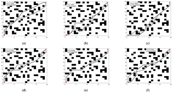 The experimental results for the large-scale maps are shown in Figure 17, with the corresponding summary of various performance indicators provided in Table 14. Due to the lower building coverage ratio (BCR) in the ordinary map, the obstacle distribution is relatively sparse, and the robot rarely encounters complex impassable segments. As a result, the path planning results in fewer turning points. In contrast, in the urban map, where the BCR is higher, there are fewer passable routes and denser obstacles, requiring the robot to navigate around many obstacles, leading to a significant increase in turning points during path planning.