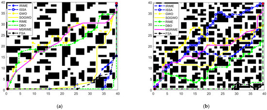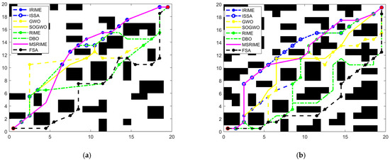 Experimental results of small-scale map path planning. (a) Small ordinary map. (b) Small urbanization Map.