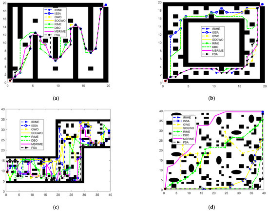 In terms of final results, the MSRIME algorithm consistently achieves the optimal path length across all tested environments. Although the MSRIME algorithm does not achieve the shortest average path length in urban maps, it is only 0.4728 units longer than the ISSA algorithm, which ranks first, indicating a minor gap in path length performance. Notably, in the small-scale urban map, MSRIME achieves the best performance across all indicators except execution time. However, the execution time difference between MSRIME and the fastest algorithm is only 0.0622 s, demonstrating its competitive efficiency.